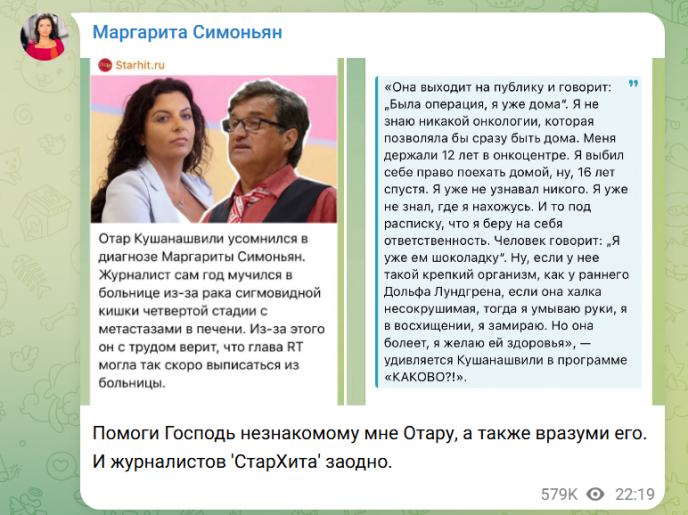 Однако не все отреагировали сочувственно. О. Кушанашвили резко высказался по поводу поведения Симоньян, заявив, что публичные люди, по его мнению, не должны апеллировать к вере, а обязаны использовать свою известность для продвижения идей медицинской ответственности, профилактики и осознанного отношения к здоровью. Он подчеркнул, что ссылка на Бога в публичном пространстве считает недопустимой и принципиально с этим не согласен.