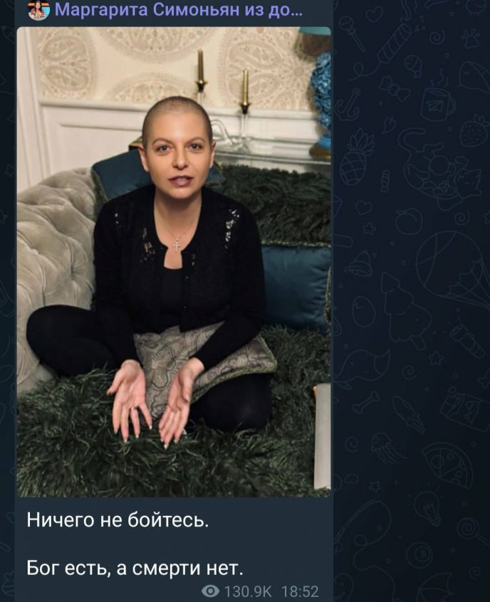 М. Симоньян впервые появилась на публике без парика и вызвала бурную реакцию в Сети. Журналистка сопроводила публикацию философским посланием, в котором дала понять, что не боится и полагается на высшие силы. Этот жест многие восприняли как откровение и акт внутренней смелости.