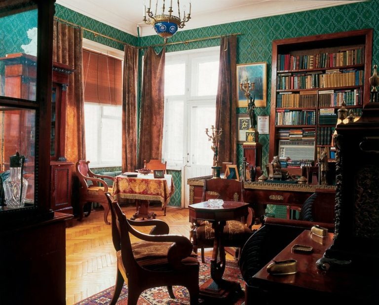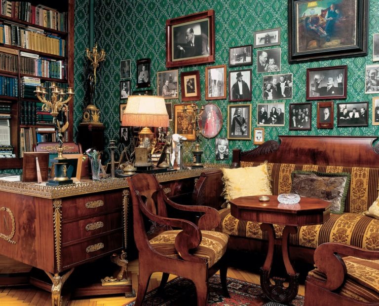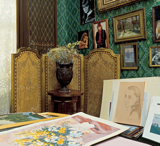 В доме царит роскошная обстановка – множество картин, яркие изумрудные обои с интересным узором.