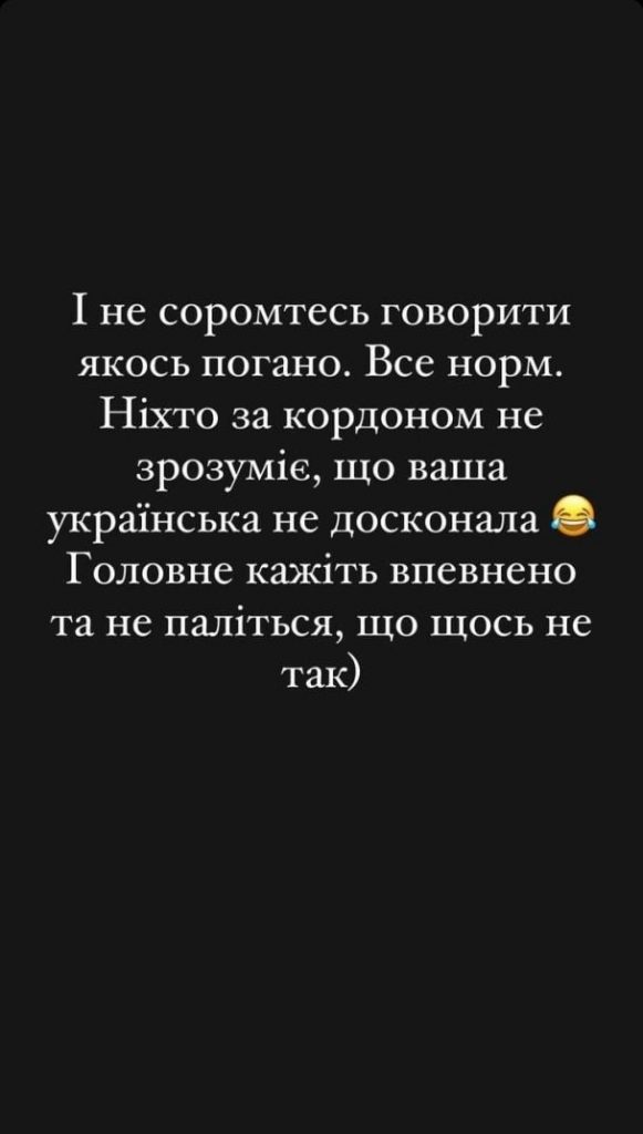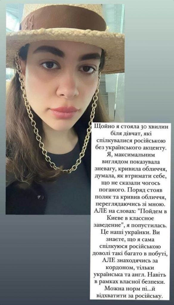 Наша героиня сообщила, что за границей общается только на английском и украинском, несмотря на свои же заявления, что брать свои интервью на украинском не собирается. Она же в тот момент призывала не делить народ по языковому принципу, чтобы через двадцать лет никто не пришел снова, кого то спасать.