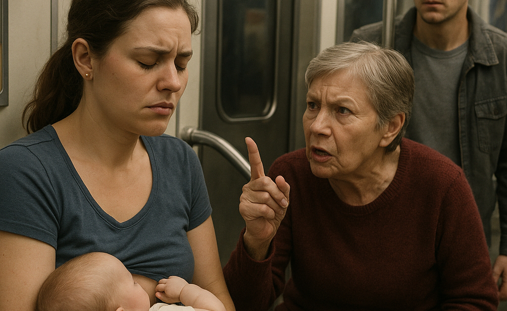 Она достала лёгкую пелёнку и аккуратно прикрылась, начав кормить малыша. Люди вокруг сделали вид, что ничего не происходит — кто-то отвернулся к окну, кто-то уткнулся в телефон. Казалось, всё обошлось.