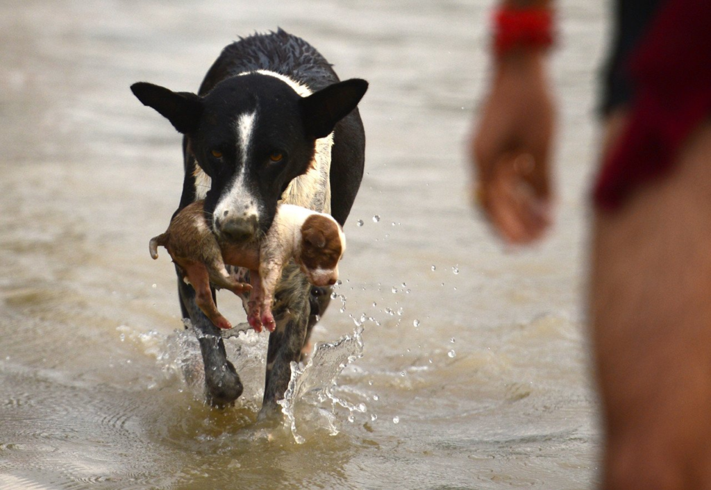 Собака подошла ближе, осторожно опустила малыша на пол и отошла, будто чего-то ждала.