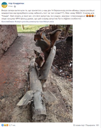 А спустя месяц Игорь решил показать «подарок», которые ему прислали прямо на 60-летие. Мужчина опубликован на своей страничке в Фейсбуке ракету, которая и прилетела к нему в дом.