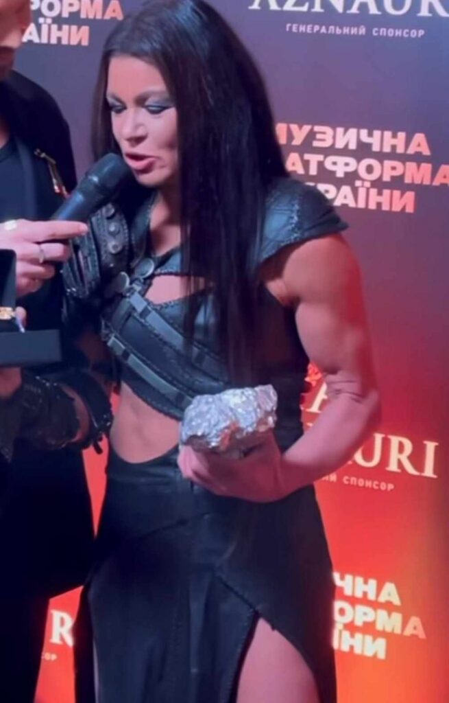 Артистка предстала в открытом образе, который был украшен высоким разрезом и отсутствием рукавов. Благодаря этому можно было разглядеть ее мускулистые руки и отчетливый пресс.