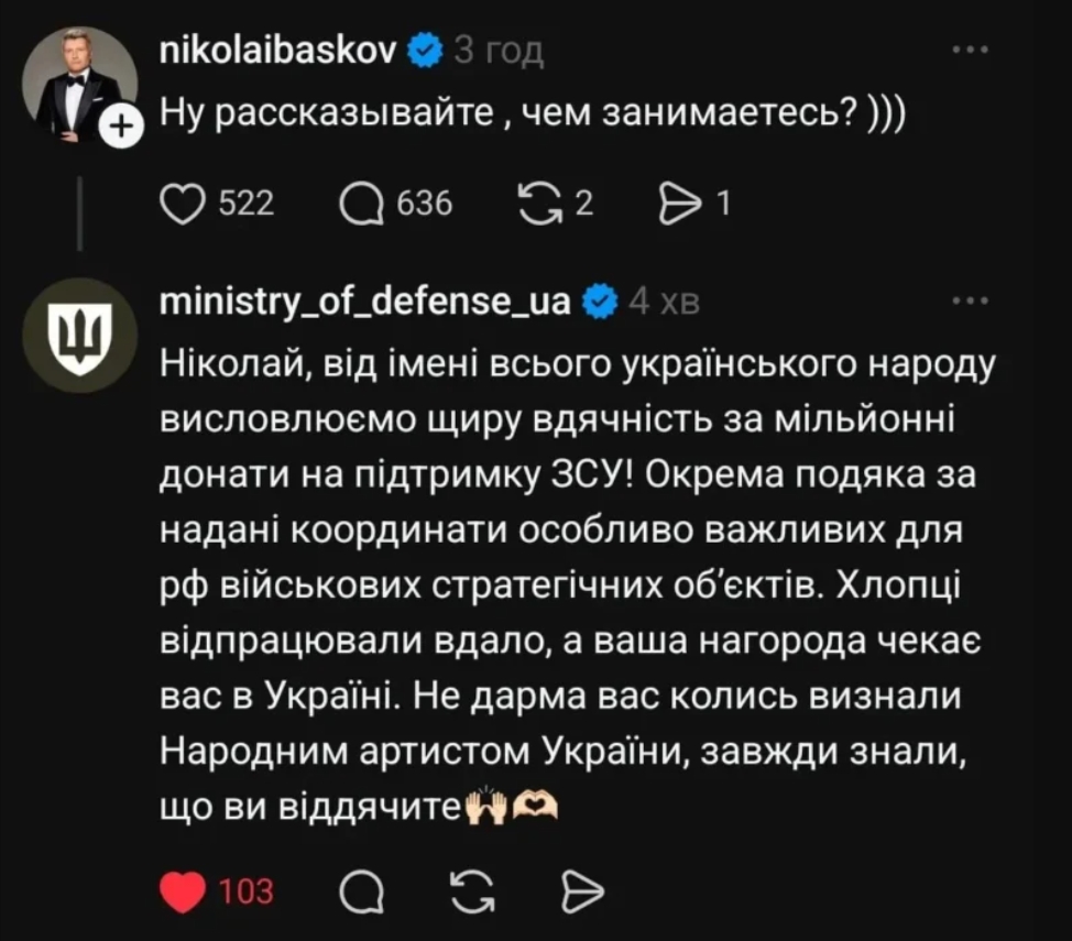 Певец Н. Басков оказался в центре бурных обсуждений после неожиданного комментария, появившегося под одной из его публикаций. Сообщается, что от имени официального аккаунта Министерства обороны Украины появился ироничный текст с благодарностью артисту за якобы оказанную поддержку и крупные пожертвования.